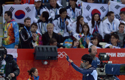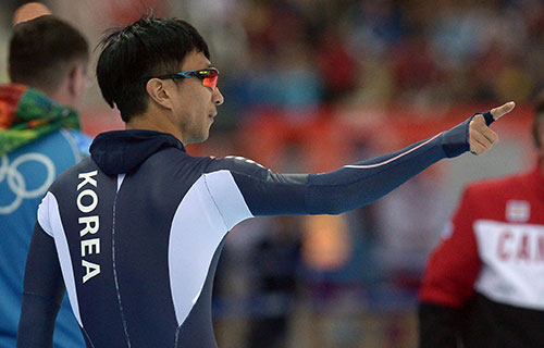 소치올림픽 남자 1000m 결승을 끝으로 33년 현역 생활을 마무리한 이규혁이 대한민국 관중들의 환호에 답례하고 있다. 뉴시스