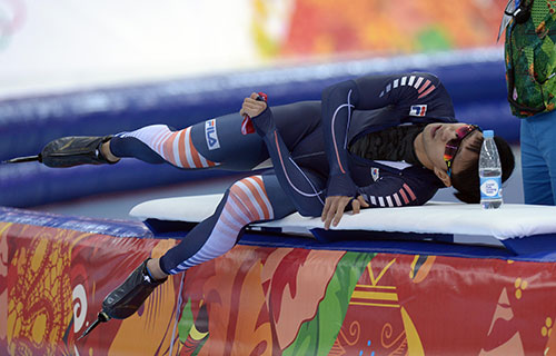 남자 1000m 결승 통과 후 탈진해 간이 침대에 눕는 이규혁. 뉴시스